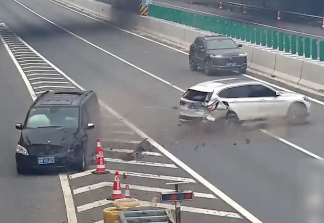 监控显示,11月24日,济广高速江西鹰潭段,一辆白色的宝马SUV本来在最左侧车道行驶,但在快错过路口时,车辆突然急刹并压实线向右变道,准备驶下路口。结果被后方黑色的商务车追尾,造成两车严重损伤。